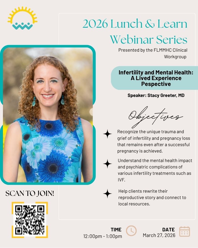 The FLMMHC Clinical Workgroup, led by Dr. Kirsten Ellingsen, serves as a vital hub for healthcare providers and mental health specialists dedicated to improving perinatal care. Through Lunch & Learn webinars and clinical consultation groups, members collaborate to share evidence-based practices, address systemic barriers, and ensure every mother in Florida has access to high-quality mental health support.
